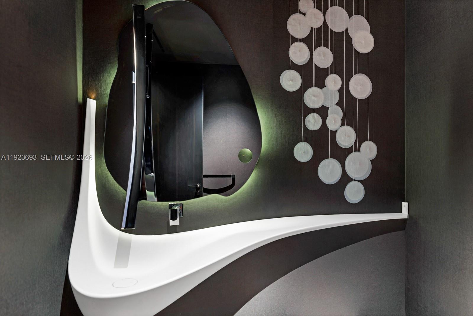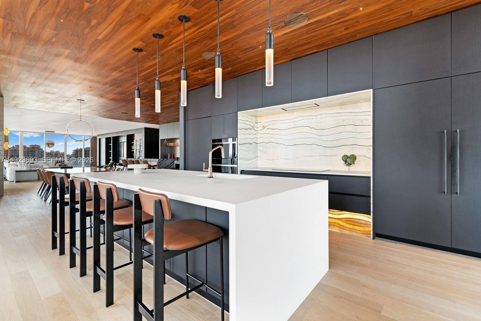Step Inside With Me! A premier corner residence at Apogee in SoFi transformed by a multi-million-dollar renovation. Surrounded by wraparound water vistas, elevated interiors unfold through a wood-paneled foyer to the grand salon featuring Italian millwork, custom media wall, and Apparatus statement chandelier. A backlit onyx kitchen showcases Poliform cabinetry, Dekton eat-in island, and spacious pantry. The bespoke marble bar enhances the entertaining areas with a chic sitting lounge. The bayfront primary suite offers curated wallpaper, a retractable TV wall, generous dressing room, and a signature bath with curved details, Taj Mahal vanities, carved-stone shelves, and smoked-glass dual shower. 3 guest suites + office, 2 car garage, and sleek terrace grill complete this refined offering.